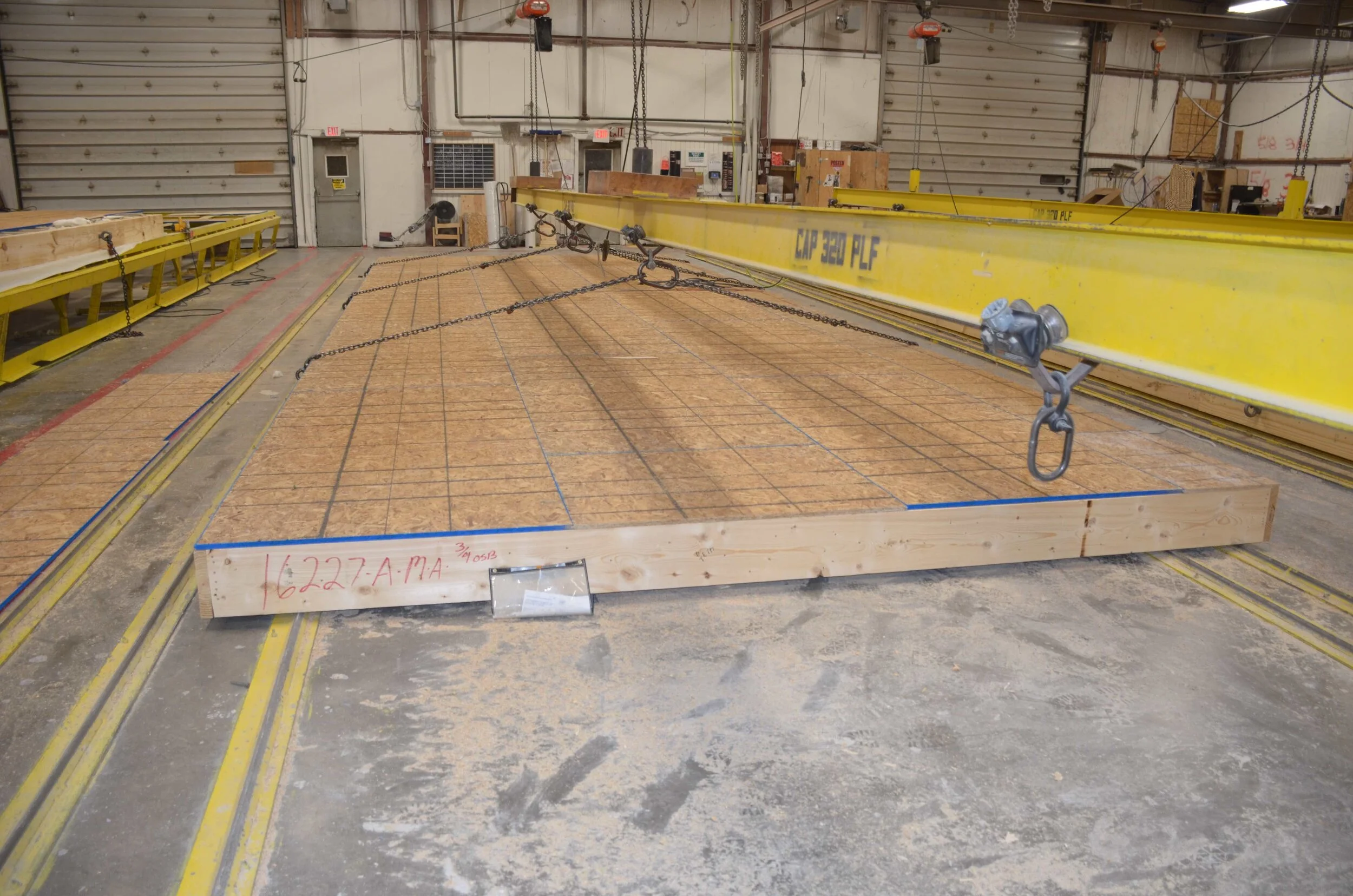 The factory team moves homes through their factory quickly, safely and efficiently, which saves homeowners money. Notice in the next photo the team is using the in-house crane system to move another builder’s floor system labeled with the serial number 16233. 16233 is traveling to New York in order to make room to have the subfloor on our project installed.